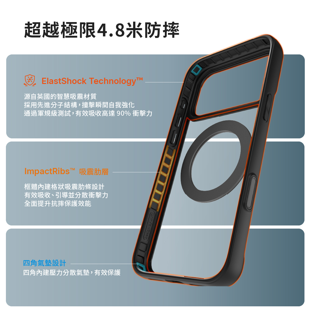 "| ElastShock Technology™:專為防摔吸震而生的智慧材料,平時柔軟貼合,遇衝擊瞬間改變分子結構吸震,提供超越 4.8 公尺的防摔能力,兼顧輕盈與高效防護。