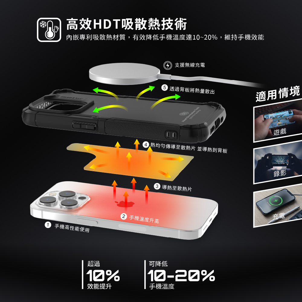 內嵌專利吸散熱材質,有效降低手機溫度達10~20%,維持手機效能