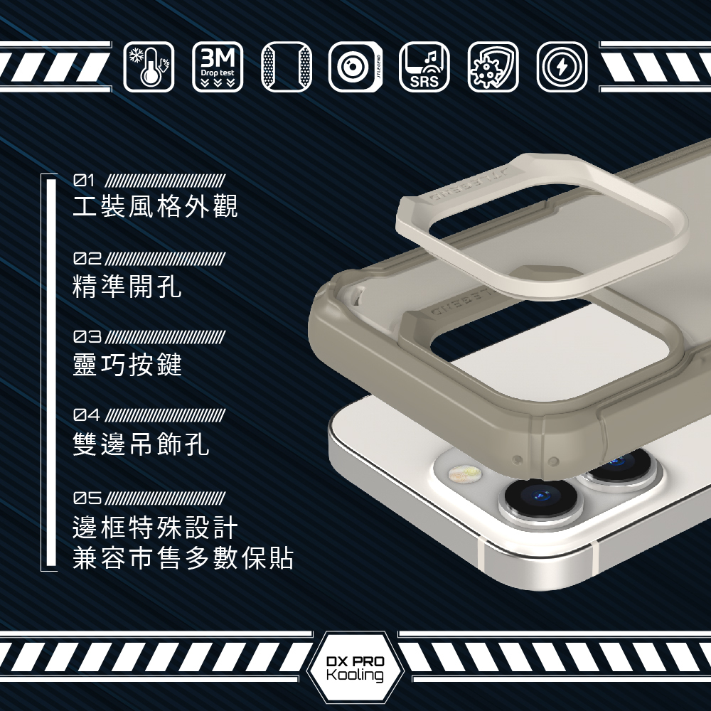 工裝風格外觀、精準開孔、靈巧按鍵、雙邊吊飾孔、邊框特殊設計兼容市售多數保貼