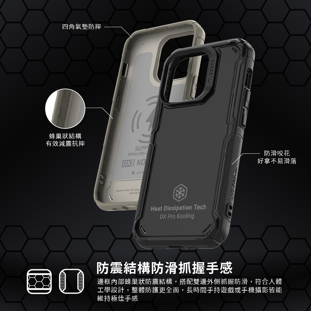 邊框內部蜂巢狀防震結構,搭配雙邊外側抓握防滑,整體防護更全面