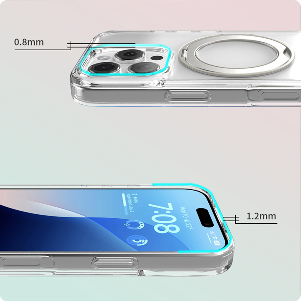 正面高出螢幕,背面高出鏡頭,避免手機螢幕、鏡頭直接碰觸桌面