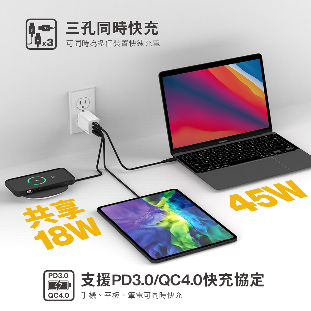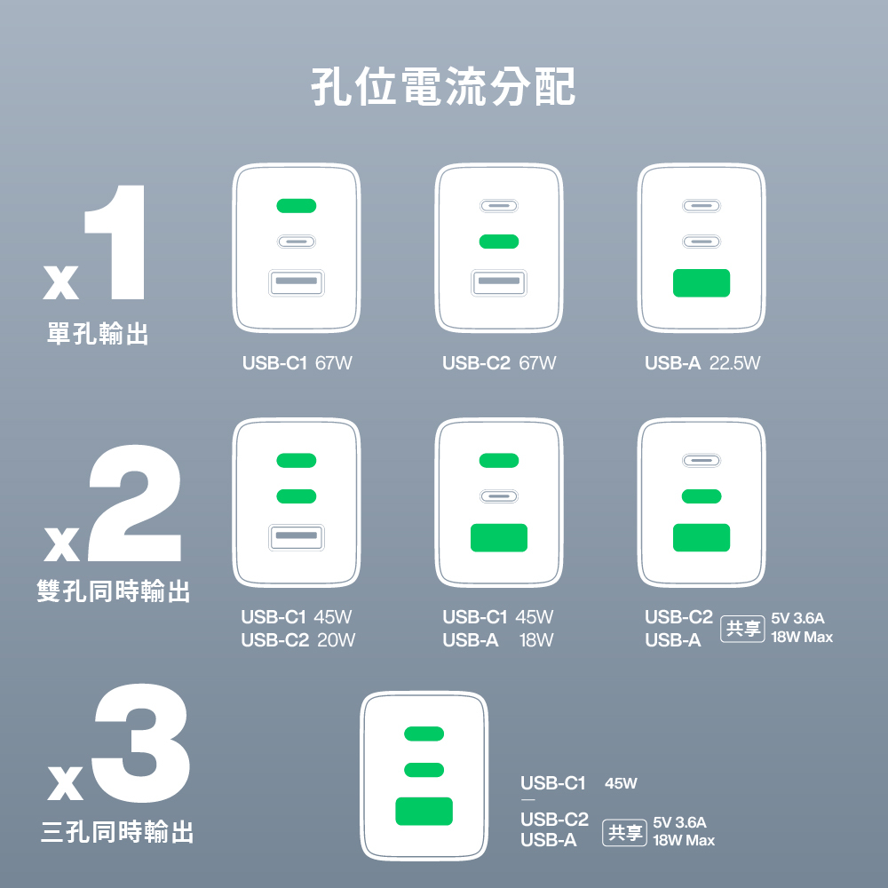 ios 輸出規格: USB-C1: 5V 3.0A, 9V 3.0A, 12V 3.0A, 15V 3.0A, 20V 3.35A, 67W Max. USB-C2 : 5V 3.0A, 9V 3.0A, 12V 3.0A, 15V 3.0A, 20V 3.35A, 67W Max. UAS-A : 4.5V 5.0A, 5V 4.5A, 9V 2.0A, 12V 1.5A, 22.5W Max.