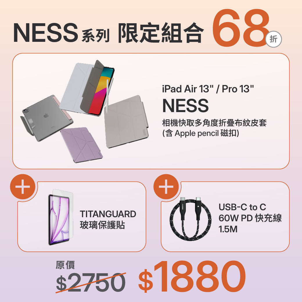 【限定組合】iPad Pro 13" Ness Pro 磁扣(奶茶灰)+保貼+C to C 60W快充線